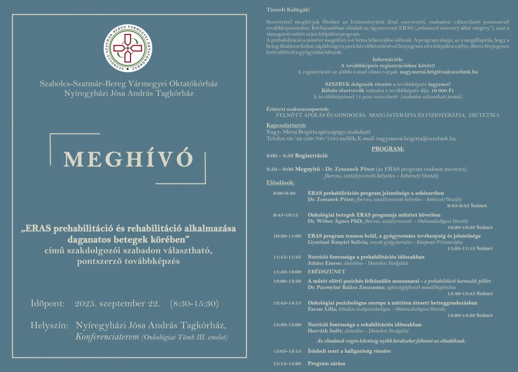 Intézményünk szeptember 22-én, „ERAS prehabilitáció és rehabilitáció alkalmazása daganatos betegek körében” címmel, szabadon válaszható, pontszerző szakdolgozói továbbképzést szervez, amelyre kórházaink dolgozóin kívül is szeretettel várják az érdeklődő szakembereket.